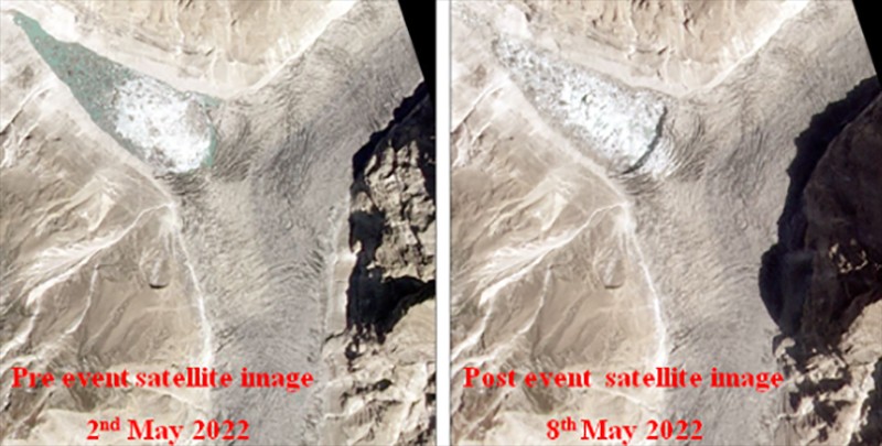 High resolution PLANET LAB images show the pre and post glacial lake outburst flood status of Shisper ice dammed lake in May 2022. Photo by Hemant Singh