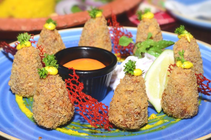 Must try Kucho Chingri Cheese Churmur (Ssrimps marinated in Bengali garam masala, coriander, cheese, and coated with cornflakes, fried and served with chatpata mayo) and the super delicious Mochar Croquette (traditionally known as mochar chop (plantain flower coated in panko crumbs, fried and served with pudina mayo).
