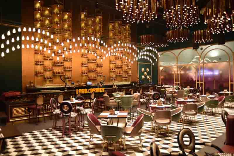 The 40 ft. double-height bar has an upper frame for the bartenders with over a whopping stack of 800 bottles, and the lower platform is for the public to enjoy their time. Captivating music, signature cocktails and classy décor—16 chandeliers and 22 lion heads adding to its royal feel, Lord of the Drinks showcases a strong neo-classical and neo-modern influences.